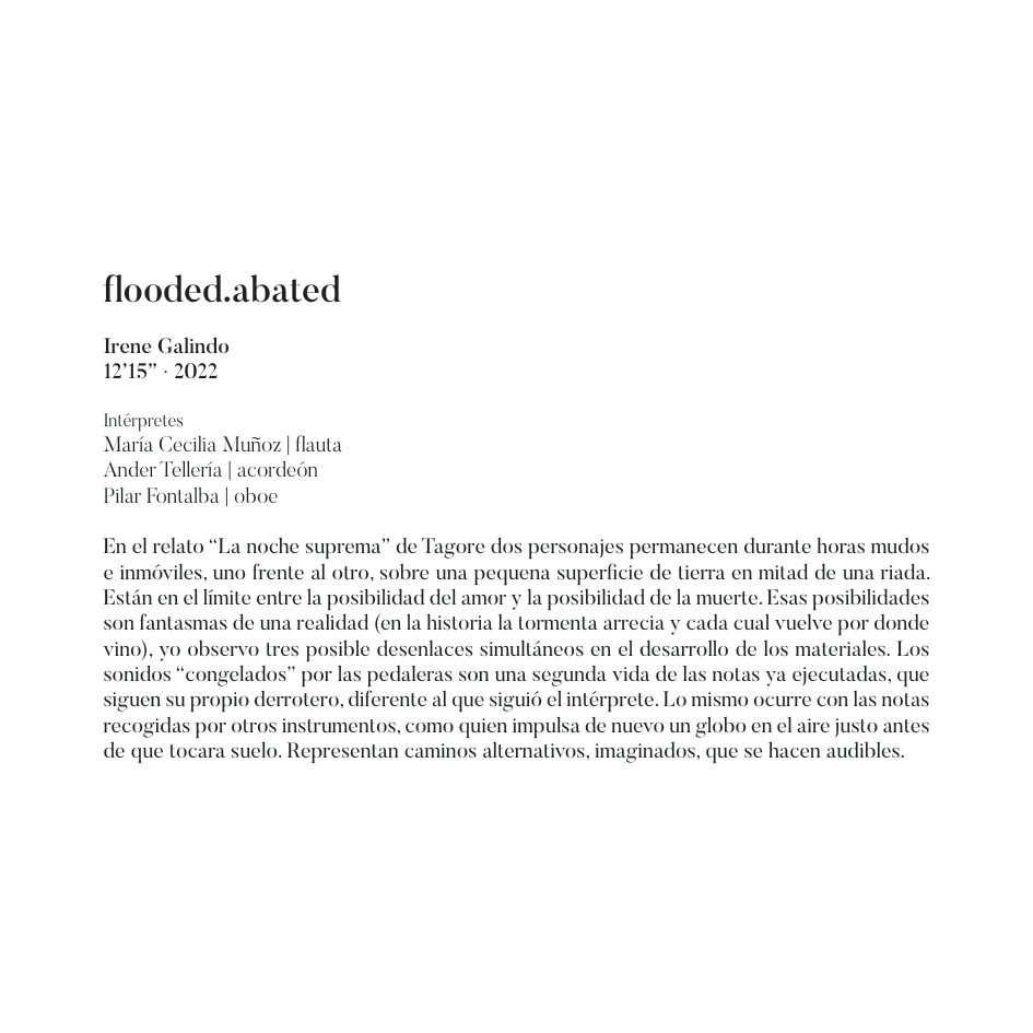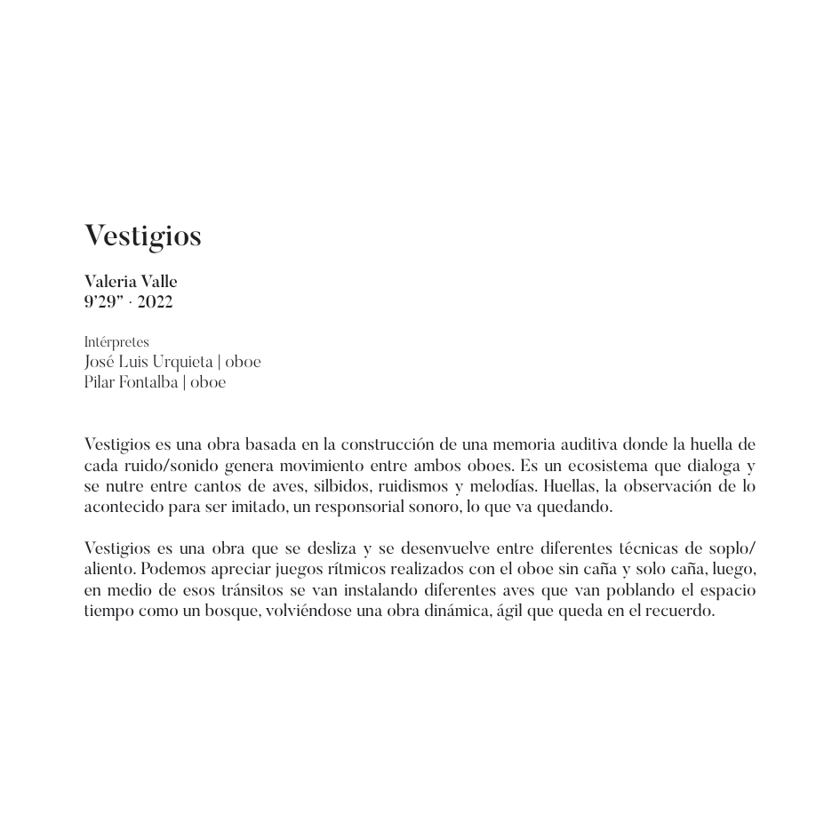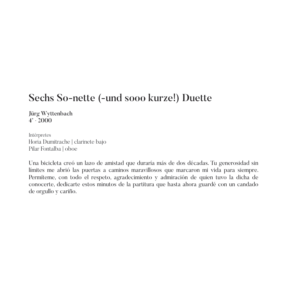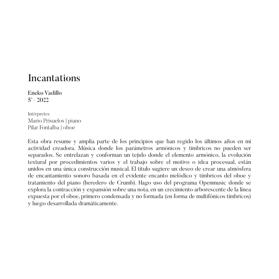 En el presente trabajo me acompañan instrumentistas con los que me unen estrechos vínculos, grandes amigos con los que comprendí que la energía en escena se puede llegar a tocar: mi preciosa musa María Cecilia Muñoz con su maravillosa fuerza, Horia Dumitrache con su sensibilidad excepcional, Ander Tellería v su incansable afán de experimentación, Ramiro García con quien desde el primer momento trabajamos de manera paralela, buscando la radicalidad en nuestros instrumentos. Para mí, José Luis Urquieta representa el trabajo, la tenacidad, la calidad v la decisión. Con el pianista Mario Prisuelos me unió antes la amistad que la música, sólo décadas más tarde descubrimos que el mismo lazo convierte nuestro entendimiento musical en algo muy hermoso.