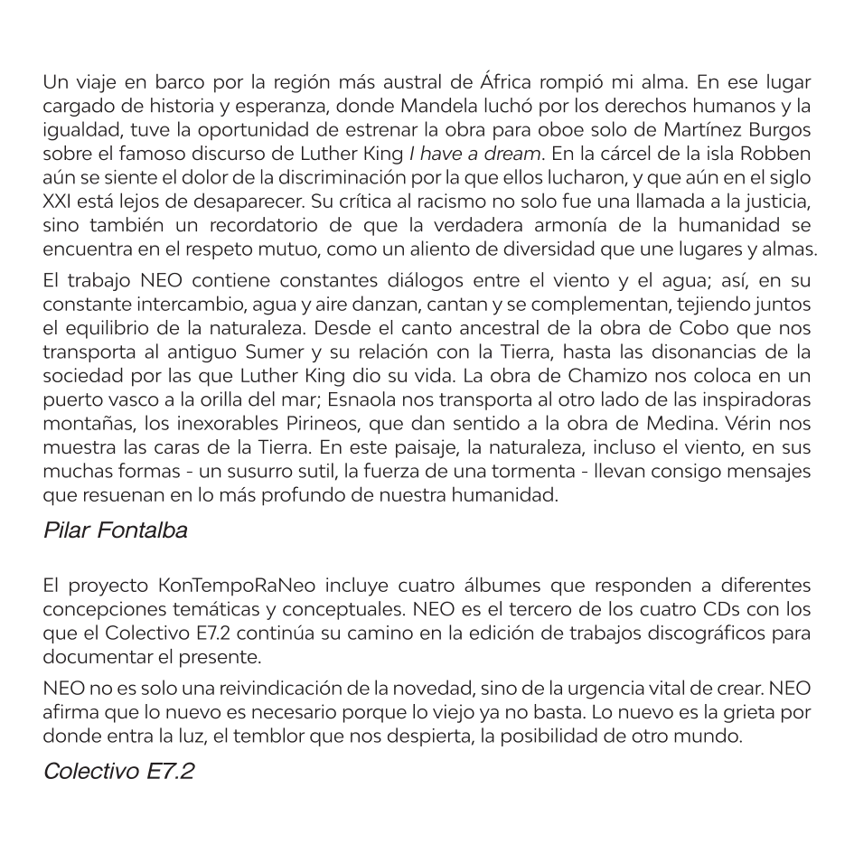 El proyecto KonTempoRaNeo incluye cuatro álbumes que responden a diferentes concepciones temáticas y conceptuales. NEO es el tercero de los cuatro CDs con los que el Colectivo E7.2 continúa su camino en la edición de trabajos discográficos para documentar el presente.