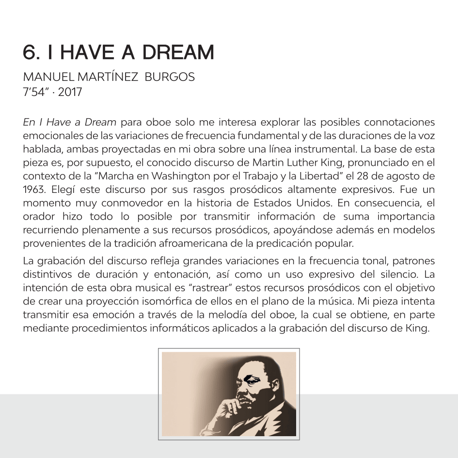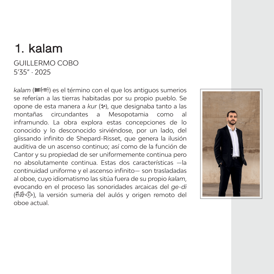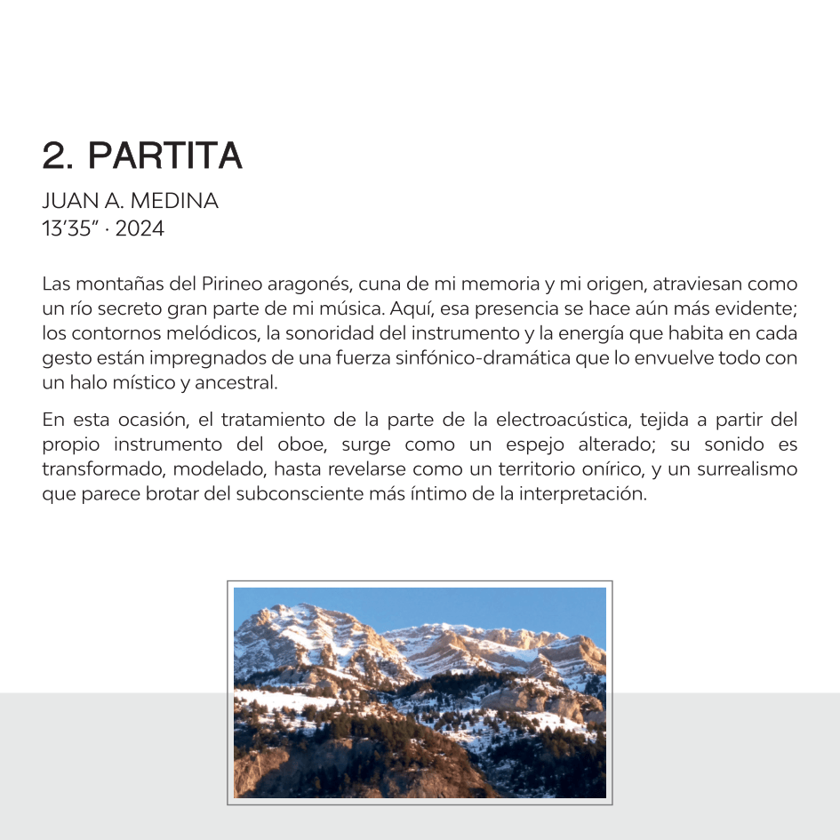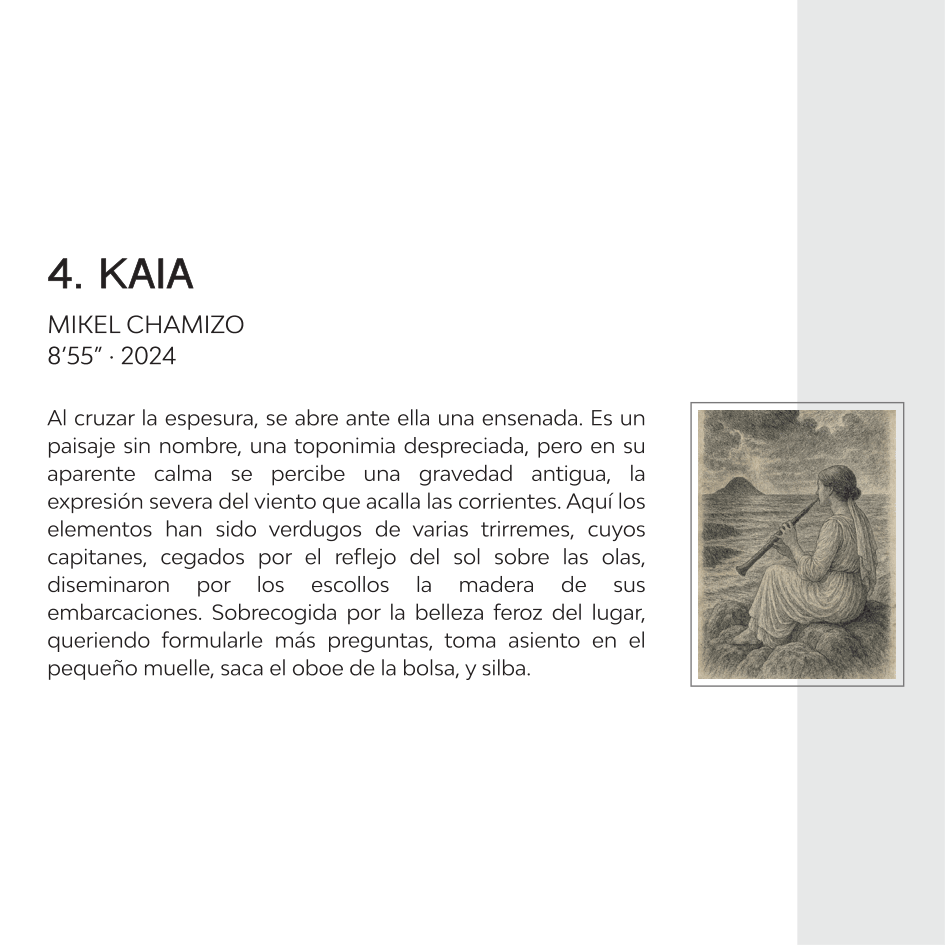 El trabajo NEO contiene constantes diálogos entre el viento y el agua; así, en su constante intercambio, agua y aire danzan, cantan y se complementan, tejiendo juntos el equilibrio de la naturaleza. Desde el canto ancestral de la obra de Cobo que nos transporta al antiguo Sumer y su relación con la Tierra, hasta las disonancias de la sociedad por las que Luther King dio su vida. La obra de Chamizo nos coloca en un puerto vasco a la orilla del mar; Esnaola nos transporta al otro lado de las inspiradoras montañas, los inexorables Pirineos, que dan sentido a la obra de Medina. Vérin nos muestra las caras de la Tierra. En este paisaje, la naturaleza, incluso el viento, en sus muchas formas – un susurro sutil, la fuerza de una tormenta – llevan consigo mensajes que resuenan en lo más profundo de nuestra humanidad.